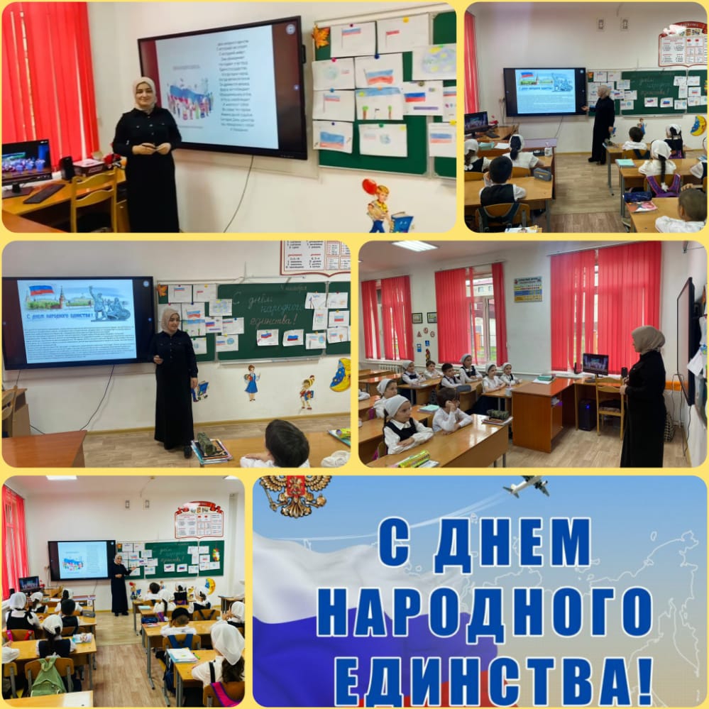 C 21-29.10.2022г. были проведены мероприятия, посвященные Дню народного единства. В мероприятиях приняли участие обучающиеся 1- 11 классов. Для обучающихся 1 – 9 классов были проведены классные часы по теме: «В единстве наша сила». Учителя истории и обществознании провели уроки гражданственности и патриотизма «Наша сила в народном единстве». Педагог-библиотекарь организовала книжную выставку «Книга – хранительница истории». Члены РДШ и Юные Кадыровцы организовали акцию Добрых дел. Обучающиеся 7-11 классов помогли в уборке школьного двора и прилегающей территории.