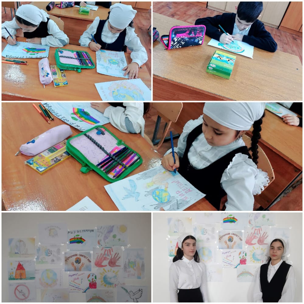 14.11.2022г. Терроризм и экстремизм — это исключительно большая опасность, способная расшатать любое, даже самое стабильное и благополучное, общество. Рамках реализации концепции духовно-нравственного воспитания и религии подрастающего поколения Чеченской Республики, среди обучающихся 4-5-х классов проведен конкурс рисунков «Мы против терроризма». Каждый участник конкурса постарался изобразить в своих рисунках, то, что олицетворяет мир на земле. Ребята внесли свой маленький вклад в борьбу за мир во всем мире и выразили имеющиеся знания через изобразительное искусство. Конкурс направлен не столько на борьбу, сколько на предупреждение терроризма, повышение уровня знаний, развитие у детей чувства бдительности, ответственности, доброты и понимания, чтобы решительно противостоять террору.