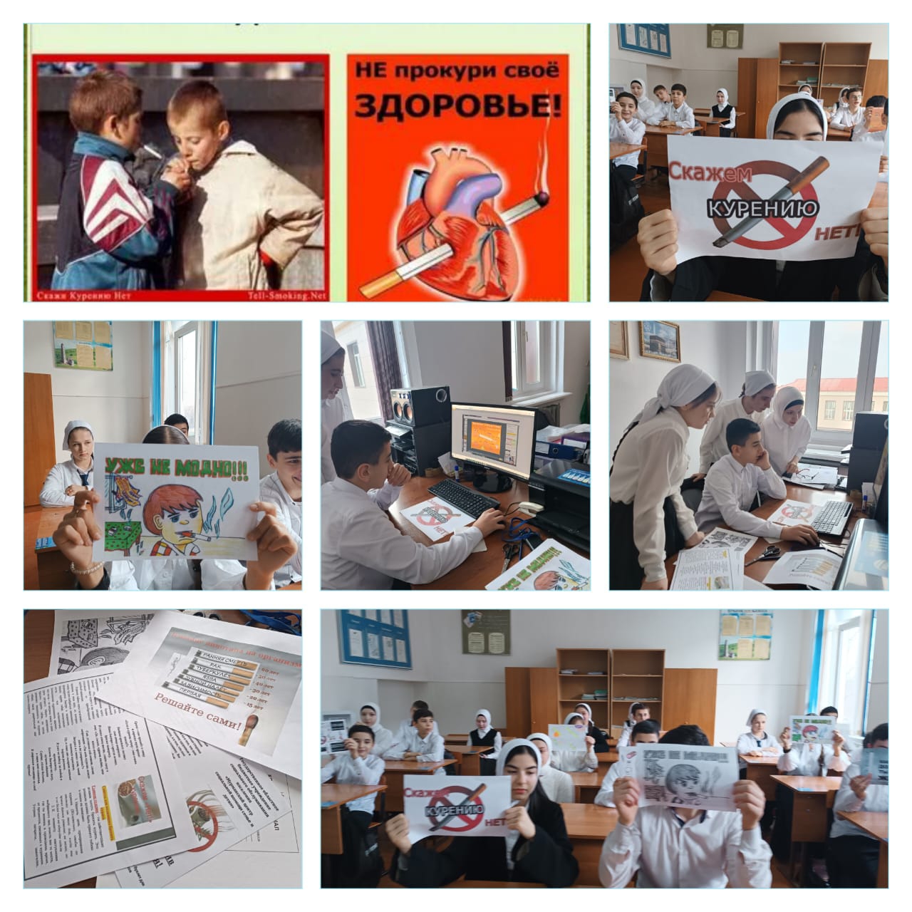 19.01.2023г. В рамках реализации Единой Концепции духовно – нравственного воспитания и развития подрастающего поколения Чеченской Республики, согласно плану воспитательной работы на 2022-2023 учебный год состоялась ежегодная акция «Скажем курению – НЕТ!». Цели проведения акции: пропаганда соблюдения Федерального закона от 23 февраля 2013 года № 15-ФЗ «Об охране здоровья граждан от воздействия окружающего табачного дыма и последствий потребления табака», привлечение внимания обучающихся к заболеваниям, возникшим от употребления табака, пропаганда отказа от курения.