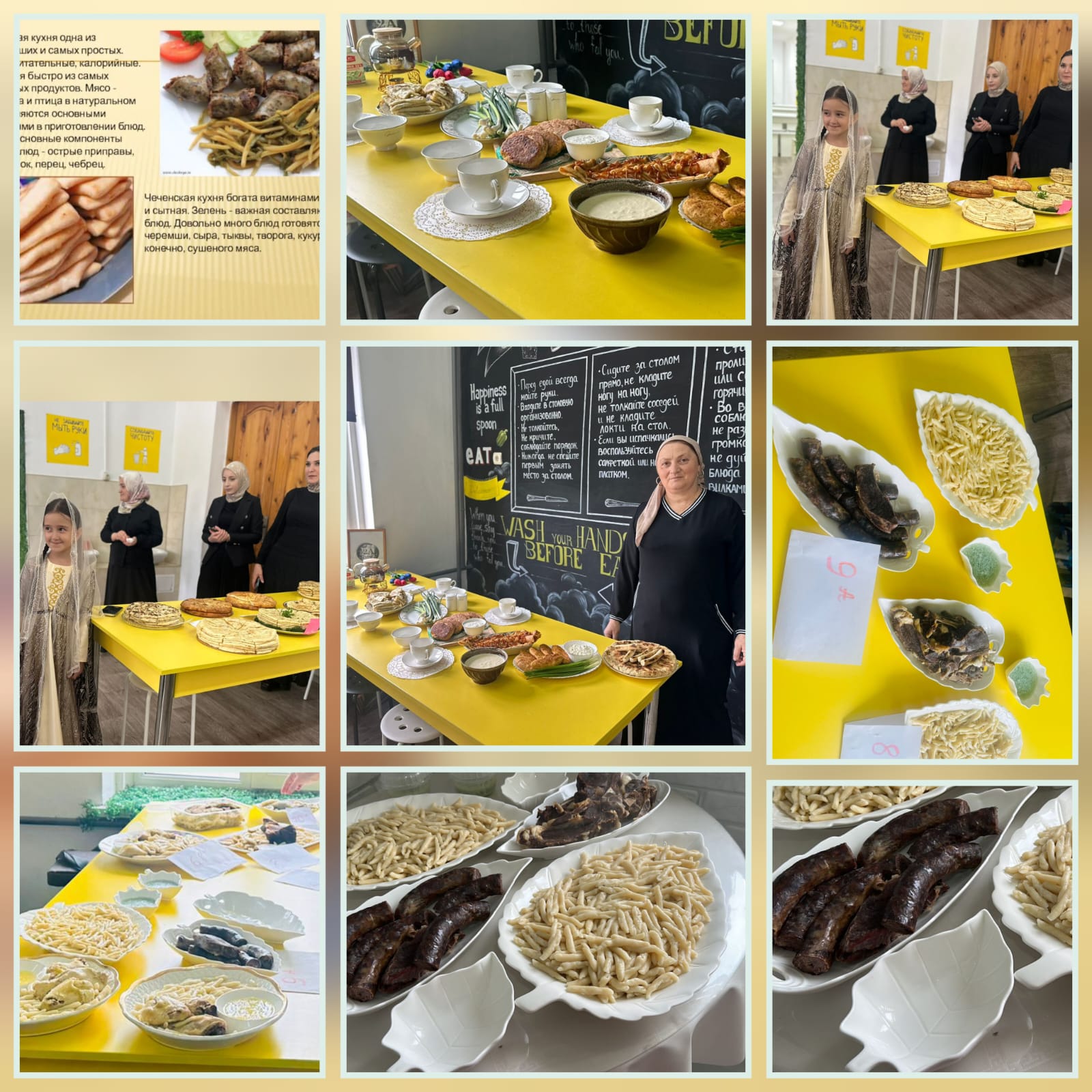 25.04.202325.04.2023г. В рамках празднования Дня чеченского языка, среди обучающихся 1-11 классов проведен конкурс «Национальное блюдо чеченцев». Целью мероприятия является сохранение и укрепление традиций приготовления и подачи блюд чеченского народа, распространение опыта приготовления национальной еды и популяризация экологически чистой и здоровой пищи, чеченских традиций гостеприимства. Среди обучающихся 1-11 классов проведен конкурс «Национальное блюдо чеченцев». Были представлены традиционные блюда чеченской кухни, в обязательную программу которой вошли такие блюда, как мясо с галушками, пироги с тыквой, творогом, чеченский лаваш. Конкурс проходил в трех номинациях: представление, оформление и вкусовые качества блюд. Участники дегустации задавали интересующие их вопросы, касающиеся приготовления того или иного блюда, его символическое значение, и даже то, как готовили данное блюдо в Чеченской Республике в былые времена и в наши дни, есть ли какие либо принципиальные отличия.Каждая, представляя свои блюда, рассказывали о том, что по столу, накрытому гостю, судят о хозяйке дома. Как говорили в старину у чеченцев, «только совместная трапеза может по-настоящему укрепить родство между людьми». Подготовила и провела мероприятие Бараева Яхита Зайнадиевна, Абаева Тамуся Абу-Хасановна, учитель чеченского языка и литературы.В номинации «Самое вкусное чеченское блюдо» заняла команда 8 «Г» класса, классный руководитель Шаипова Аминат Хусаиновна, получил 1 место. Они представили жюри самый национальный колорит – галушки с сущёным мясом (домашняя сушка собственного приготовления). Симбаригова Хава рассказала, как готовятся галушки, чтобы они получились вкусными и мягкими и о том, как дедушка, по старинке, разделывает и сущит мясо говядины.
