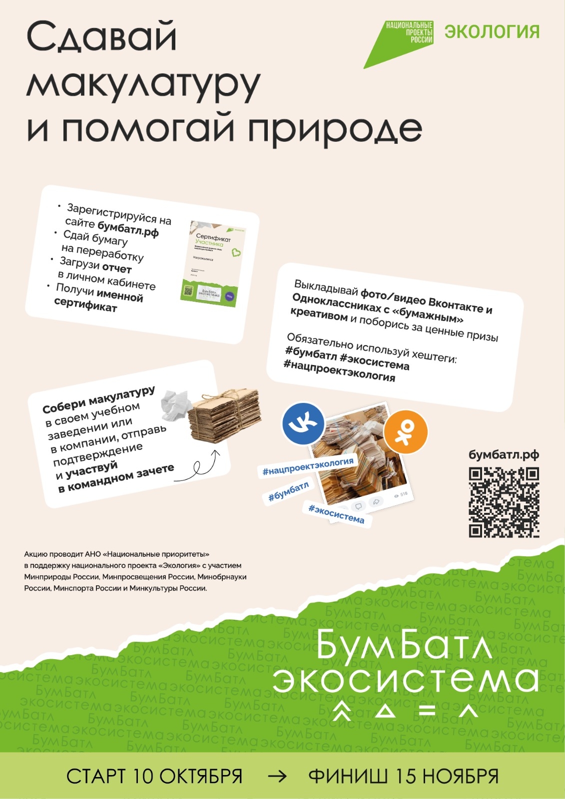 Акция «БумБатл» запускает сбор макулатуры по всей стране Четвертый сезон акции «БумБатл» стартует 10 октября. В этом году масштабный экологический проект организован АНО «Национальные приоритеты» совместно с Всероссийским экологическим общественным движением «Экосистема». Ключевая цель акции – сокращение излишнего потребления бумаги, организация системы ее переработки и формирование экологической культуры. В новом сезоне целевая аудитория акции расширится – принять участие смогут не только школьники, студенты, воспитанники детских садов, но и каждый житель страны. Бумагу будут сдавать и представители крупных производственных предприятий, бизнеса и общественных организаций. Коллективные заявки на участие принимаются с 10 октября по 2 ноября. Побороться за первенство в индивидуальном зачете можно с 10 октября по 15 ноября. «Акция "БумБатл" традиционно проводится в поддержку нацпроекта "Экология". Присоединиться к проекту может каждый – как самостоятельно, так и в составе организаций. Помощь в сборе и переработке макулатуры проекту окажут представители ключевого регионального оператора. Как и в прошлом году, мы надеемся увидеть в числе участников тысячи воспитанников детских садов, школ, колледжей, вузов, а также представителей частных компаний, заинтересованных в сохранении природных ресурсов», – отметила генеральный директор АНО «Национальные приоритеты» София Малявина. В рамках «БумБатла» волонтеры Всероссийского экологического общественного движения «Экосистема» проведут серию экологических мероприятий в каждом регионе страны. Участники акции будут сдавать макулатуру, что поможет сократить объемы мусорных полигонов и помочь сохранить лесной фонд России. По словам сопредседателя движения «Экосистема» Андрея Руднева, акция привлекает внимание не только ориентированной на охрану окружающей среды молодёжи. «Уже на подготовительном этапе акции видно, насколько молодые россияне вовлечены в экологические вопросы и в экологическую политику, что не может не радовать. Молодые люди прекрасно представляют, сколько нужно вырубленных деревьев для производства бумаги. Поэтому для сохранения экологии самым правильным решением является использование вторсырья. Сбор макулатуры становится экологическим трендом. Поэтому в рамках акции "БумБатл" мы планируем запустить несколько интересных и вовлекающих в повестку мероприятий», – сказал Андрей Руднев. Чтобы принять участие в акции «БумБатл», необходимо зарегистрироваться на сайте бумбатл.рф. При регистрации нужно указать организацию или подтвердить самостоятельное участие, затем выбрать на интерактивной карте ближайший пункт приема и отнести бумагу туда. По итогам акции оргкомитет определит лидеров по объемам сданного бумажного сырья среди детских садов, школ, ссузов, вузов, компаний и в индивидуальном зачете. Всех участников акции ждут подарки. Также будут объявлены самые результативные регионы страны. Акция «БумБатл» проходит в поддержку национального проекта «Экология» при участии Минприроды России, Минпросвещения России, Минобрнауки России, Минкультуры России и Минспорта России. Экологический партнер акции – ППК «Российский экологический оператор». Всероссийскую акцию по сбору макулатуры в 2023 году поддерживают: Московский театр мюзикла, Госк