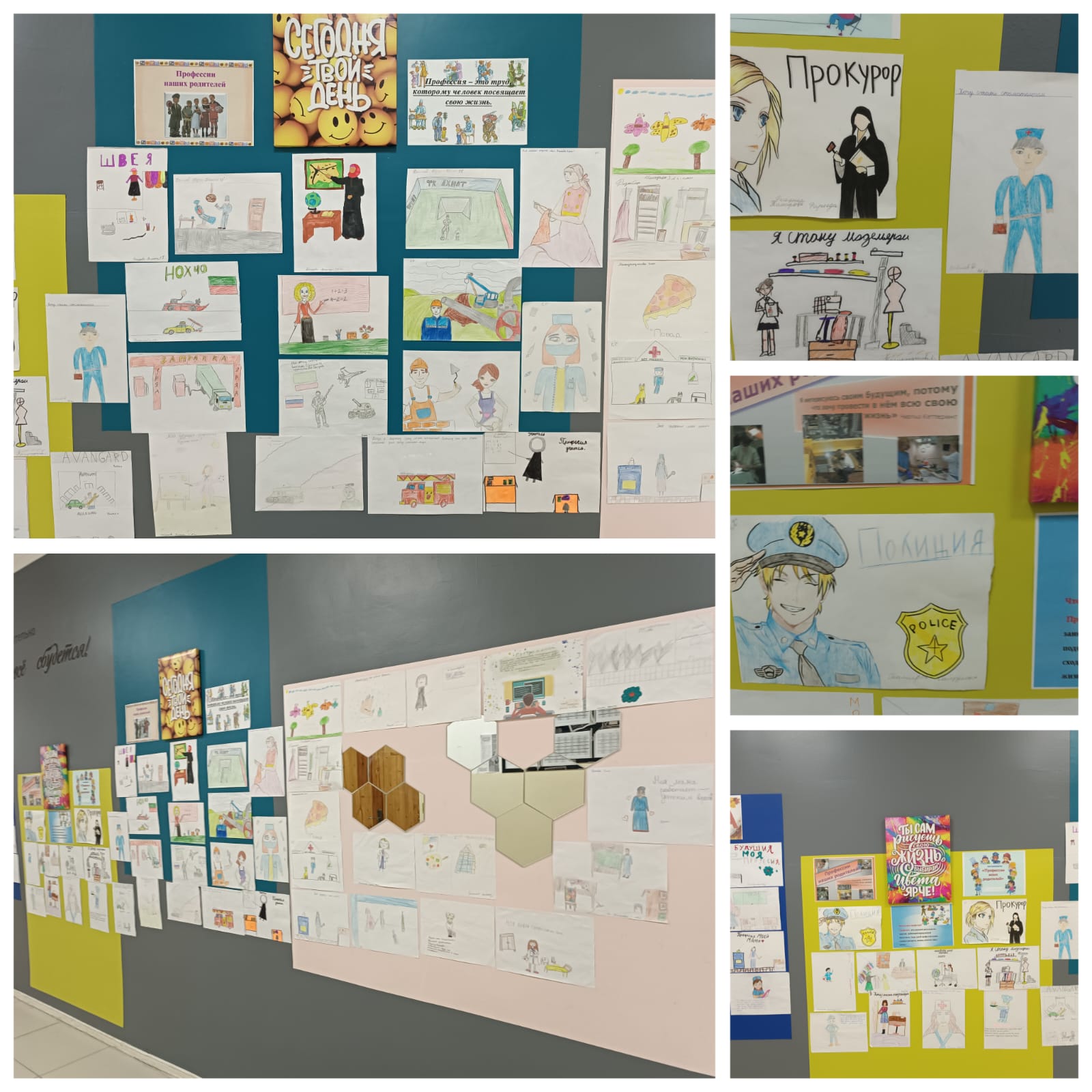 Обучающимся предложили с помощью карандашей и красок взглянуть на мир профессий. Любимыми профессиями маленьких художников оказались очень разнообразными: работник банка, менеджер, визажист, программист, библиотекарь, врач, машинист, строитель, учитель и многие другие. Ребята с удовольствием рисовали своих пап и мам на работе, показали уважение к профессиям и их важность. Рисунками оформили фойе школы.