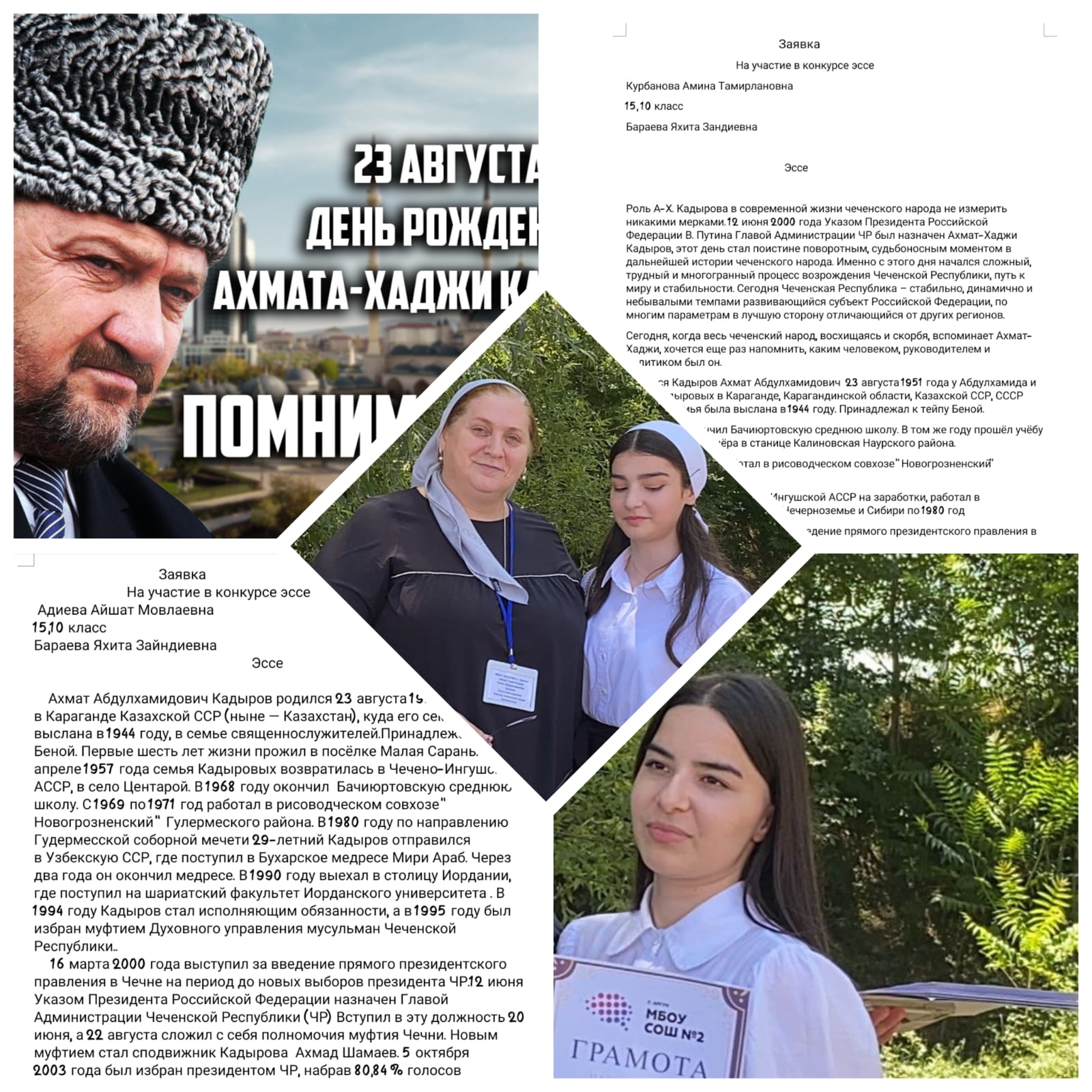 Обучающиеся 9-11классов приняли в республиканском конкурсе сочинений-эссе «Герои не умирают», посвященного Первому президенту Чеченской Республики, Герою России А.А. Кадырову. Учредитель конкурса -Мин
