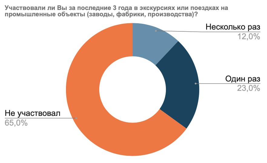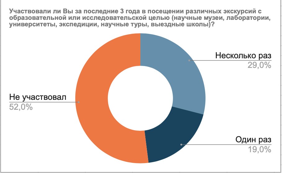 Значительная часть опрошенных за последние 3 года имела опыт участия в образовательных и исследовательских экскурсиях (48%) и в экскурсиях на промышленные объекты (35%). Также абсолютное большинство (более 97%) респондентов видит ценность таких мероприятий не только для себя, но и для своих детей, отмечая, что хотели бы дать им подобный опыт.