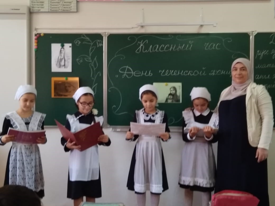 19.09.2018День чеченской женщины торжественно празднуется сегодня во всех уголках Чеченской Республики. Согласно воспитательному плану с11 сентября в школе проходили мероприятия, посвященные Дню Чеченской женщины.