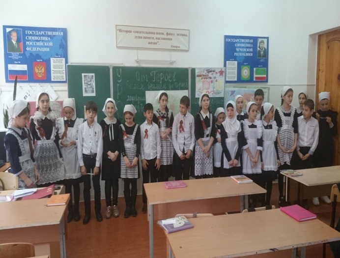 С 05 по 09.12.2018г. в 1-11 классах прошли классные часы на тему «Герои Отечества», «Победные дни России», «Память о героях не уйдёт в забвенье». Открытые классные часы провели классные руководители Джабараилова Л.М.(5 «а»), Мусханова Х.В. (4 «г»), Габатаева И.В.(6«а» кл.), Бегуева Б.А. (5 «г»), Межиева Д.Ш. (5 «б»),Эльсултанова Т.В..(6 «г» кл.), Мусаева Л.А. (3 «в»).